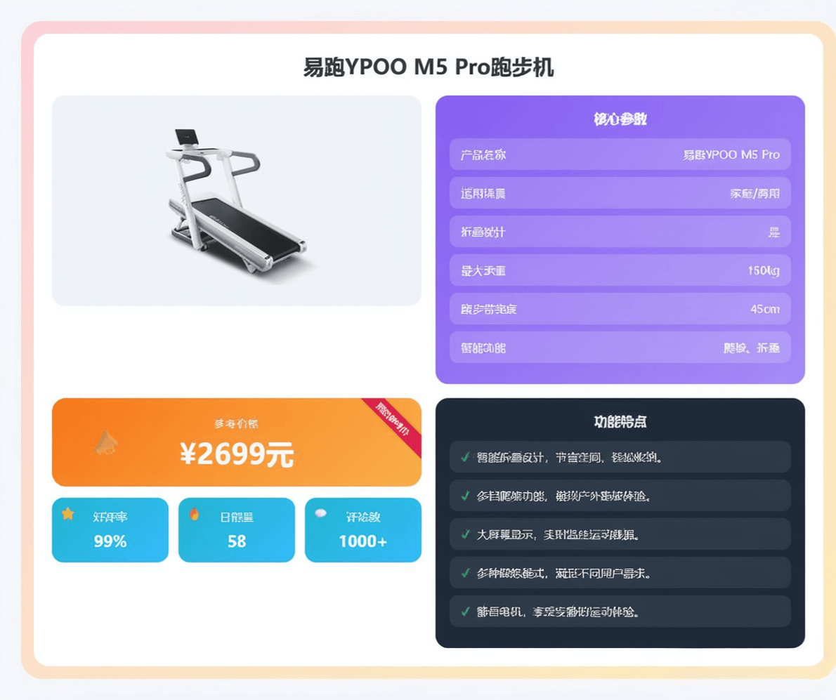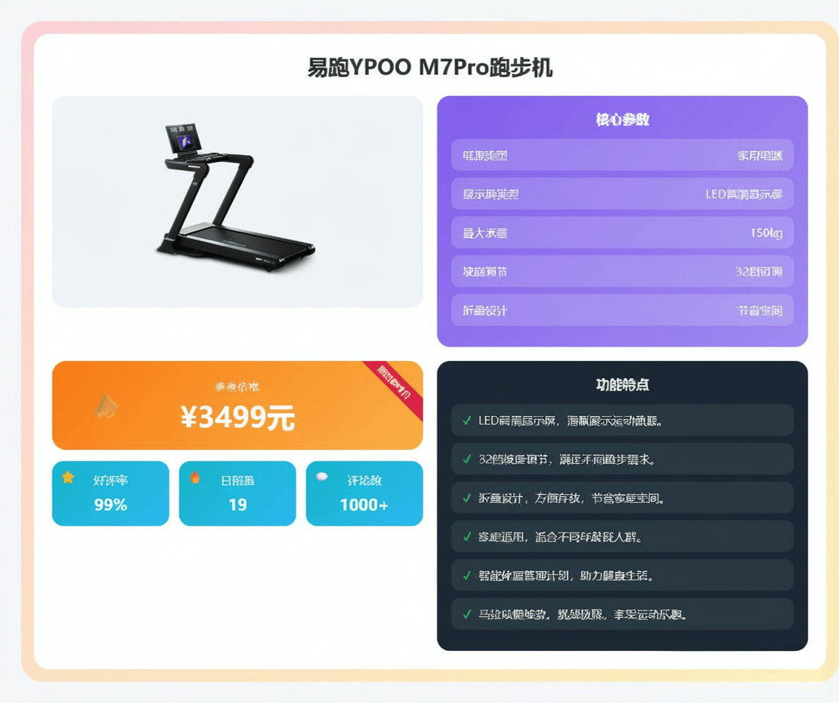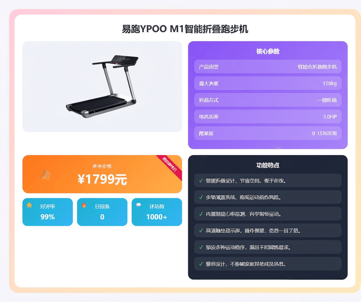 对于预算有限的用户,易跑YPOO M1智能折叠跑步机是一个入门级选择,售价1799元。它的核心卖点是“智能折叠”,体积小巧,方便收纳。